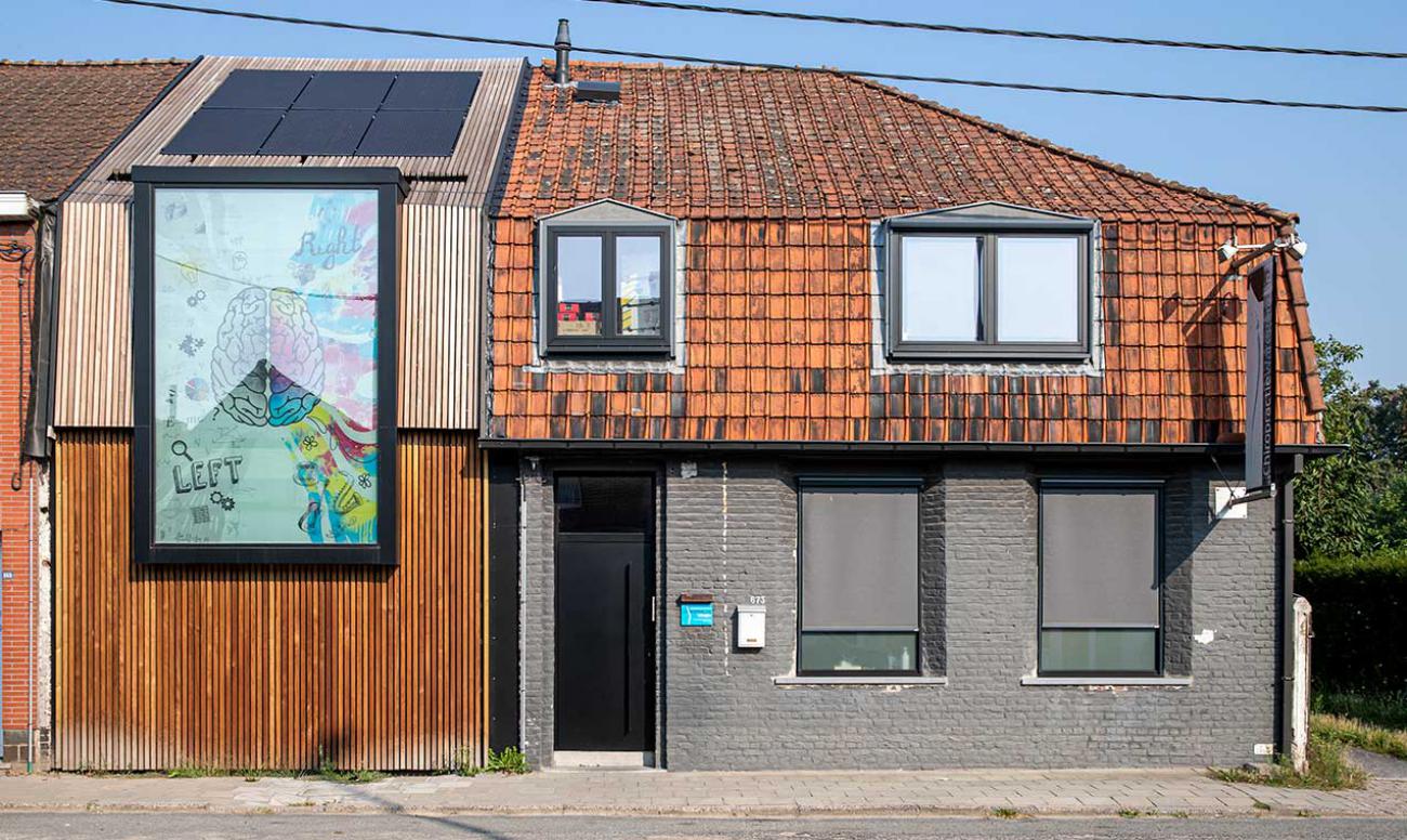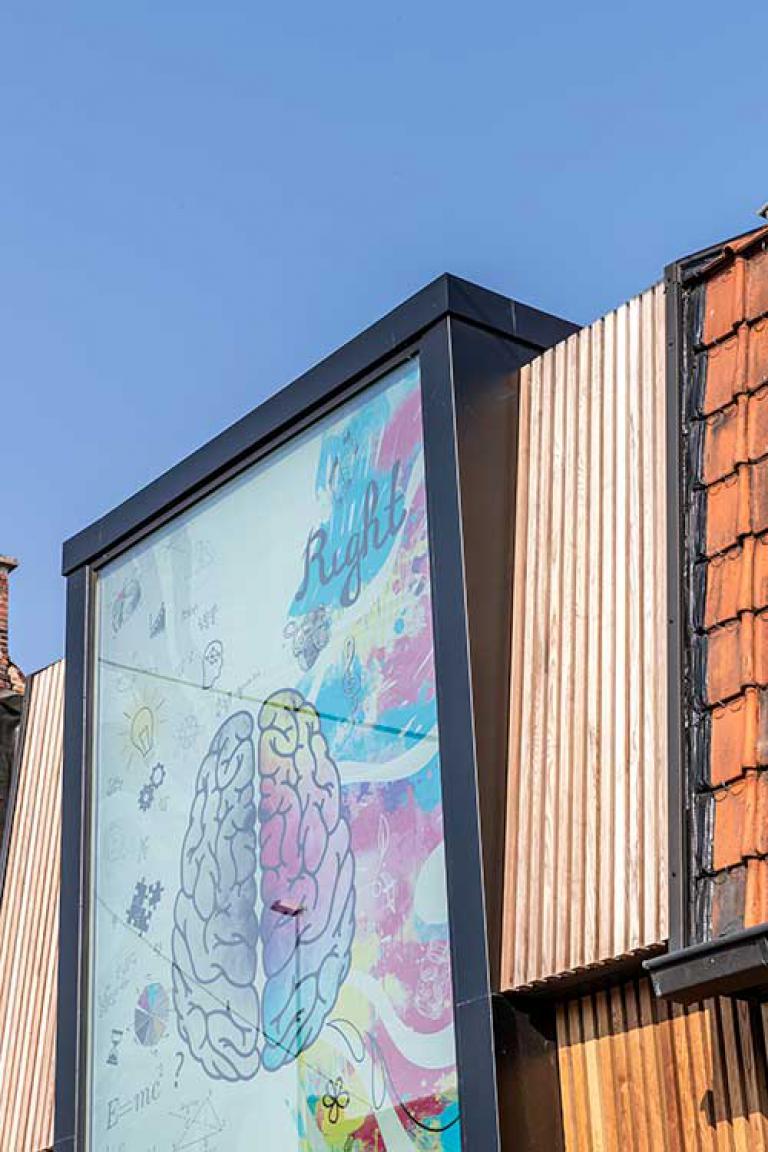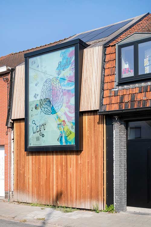 Deze gevelbekleding is net iets anders dan normaal, de bekleding loopt van op de muur door tot over het dak. Dit ondanks de schuine wanden van het gebouw.